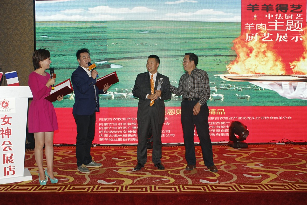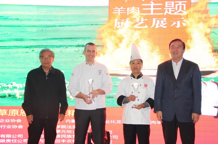 本次廚藝比拼展示主要是中法兩國廚師之間的高手對決。兩國大廚根據(jù)羊肉的不同部位烹飪出各道菜品。本次比拼的標(biāo)準(zhǔn)主要是養(yǎng)生、創(chuàng)意和具有地域特色。各評委經(jīng)過仔細(xì)品嘗后評選出特等獎(jiǎng)、一等獎(jiǎng)各一名。最終由遠(yuǎn)道而來的法國大廚獲得特等獎(jiǎng),我們中國廚師隊(duì)獲得一等獎(jiǎng)。原副主任雷·額爾德尼和原副主席傅守正為獲獎(jiǎng)選手頒發(fā)獎(jiǎng)杯。