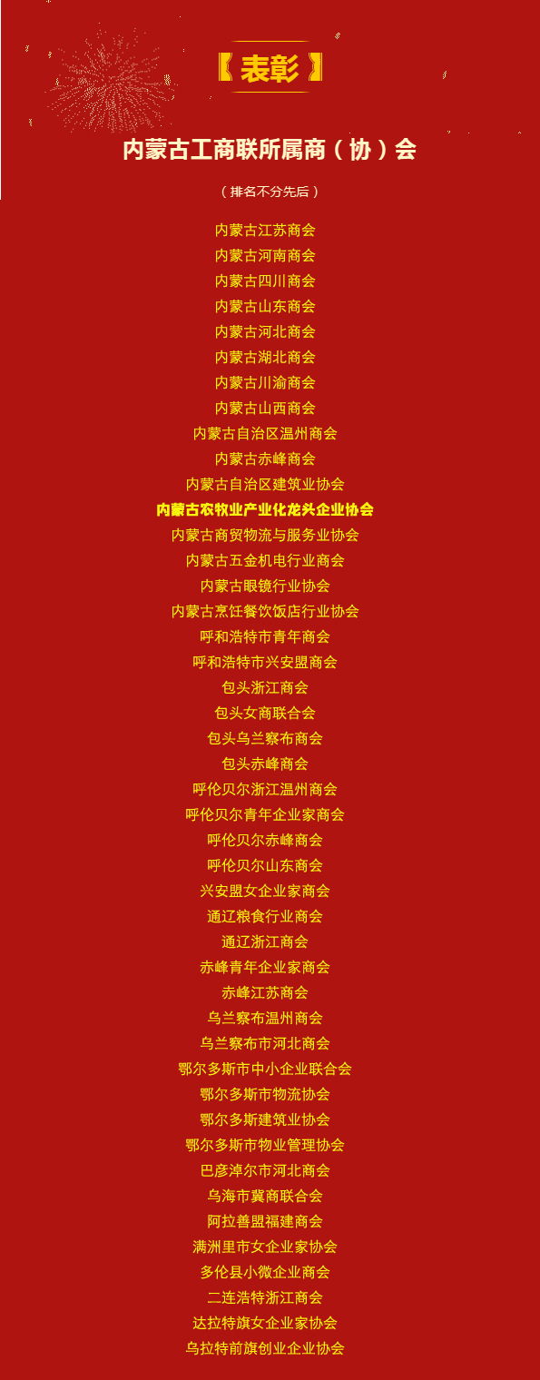 內(nèi)蒙古農(nóng)牧業(yè)產(chǎn)業(yè)化龍頭企業(yè)協(xié)會(huì)已連續(xù)三年獲此殊榮!在接下來(lái)的工作中,協(xié)會(huì)將珍惜榮譽(yù),再接再厲,堅(jiān)持以習(xí)近平新時(shí)代中國(guó)特色社會(huì)主義思想為指導(dǎo),深入貫徹落實(shí)黨中央關(guān)于商會(huì)改革和發(fā)展的決策部署,圍繞內(nèi)蒙古自治區(qū)黨委政府工作大局,緊扣“兩個(gè)健康”主題,充分發(fā)揮協(xié)會(huì)示范帶動(dòng)作用,踐行協(xié)會(huì)的社會(huì)責(zé)任擔(dān)當(dāng),不斷提高協(xié)會(huì)建設(shè)水平,爭(zhēng)創(chuàng)中國(guó)特色一流商協(xié)會(huì)組織,為促進(jìn)內(nèi)蒙古農(nóng)牧業(yè)高質(zhì)量發(fā)展,為全面推進(jìn)鄉(xiāng)村振興、實(shí)現(xiàn)中華民族偉大復(fù)興做出新的更大貢獻(xiàn)。