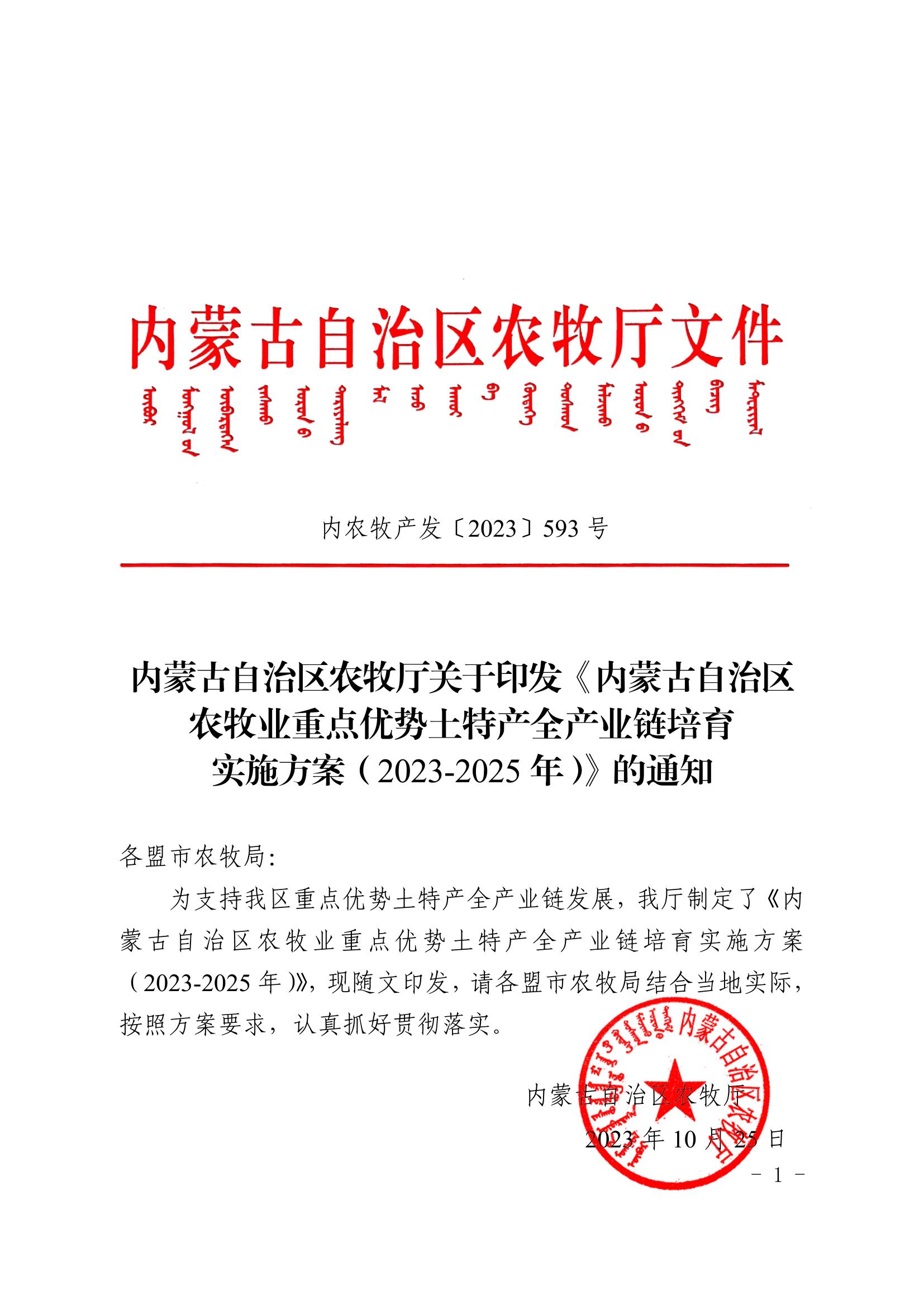 標(biāo)題:內(nèi)蒙古自治區(qū)農(nóng)牧廳關(guān)于印發(fā)《內(nèi)蒙古自治區(qū) 農(nóng)牧業(yè)重點優(yōu)勢土特產(chǎn)全產(chǎn)業(yè)鏈培育 實施方案(2023-2025年)》的通知