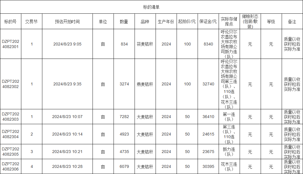 轉讓標的為莜麥秸稈、燕麥秸稈、大麥秸稈,涉及面積莜麥秸稈834畝、燕麥秸稈3274畝、大麥秸稈(1-4標)分別為7282畝、4923畝、4735畝、6079畝,意向受讓方在競買前應自行對標的預估數(shù)量和質量情況進行充分了解,交易標的均以實際狀況為準。標的存放地位于呼倫貝爾農(nóng)墾拉布大林農(nóng)牧場有限公司,詳情見標的清單: