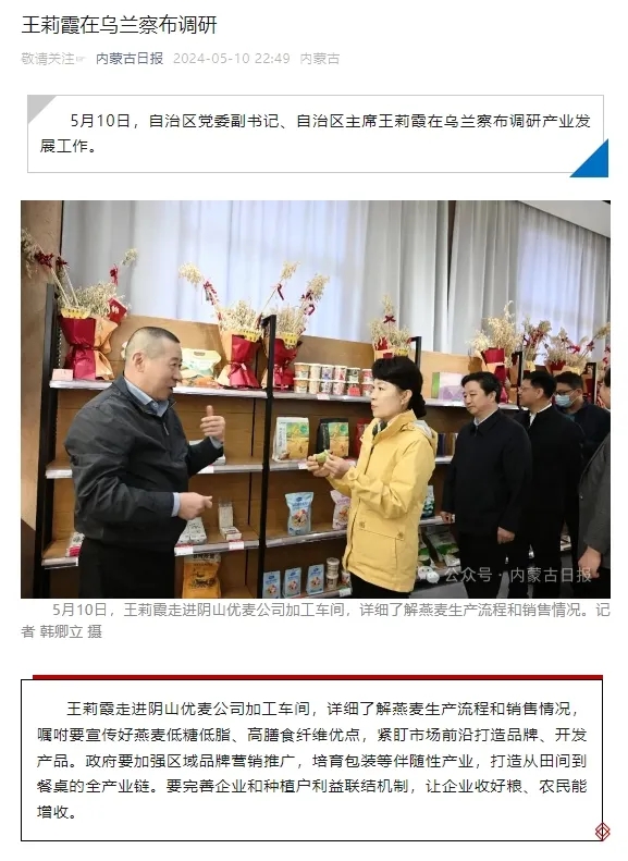 5月10日,自治區(qū)黨委副書記、自治區(qū)主席王莉霞深入內(nèi)蒙古陰山優(yōu)麥食品有限公司考察調(diào)研。